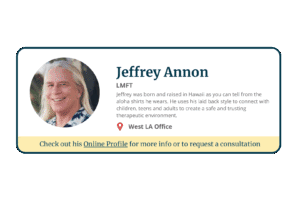 Jeffrey was born and raised in Hawaii as you can tell from the aloha shirts he wears. He uses his laid back style to connect with children, teens and adults to create a safe and trusting therapeutic environment.